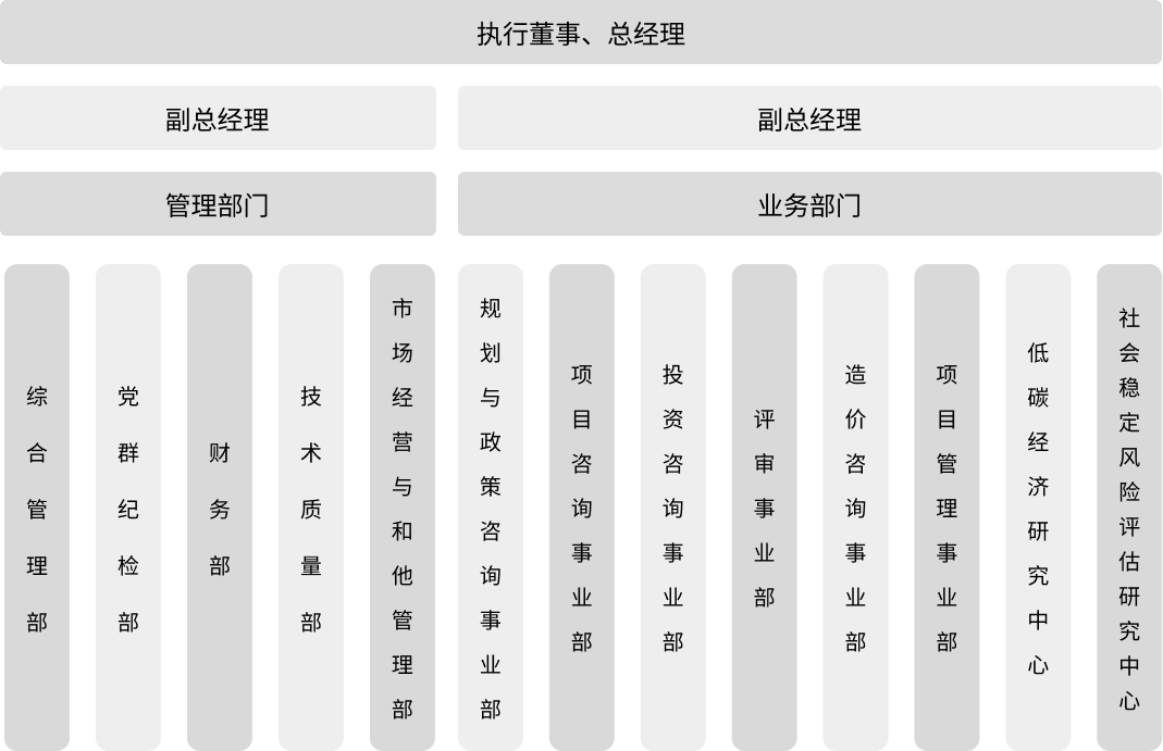 公司本科及以上學(xué)歷員工占比93%,碩士及以上學(xué)歷員工占比47%;正高級(jí)工程師7人,高級(jí)工程師28人,擁有全國(guó)咨詢工程師(投資)、全國(guó)注冊(cè)造價(jià)工程師以及注冊(cè)城鄉(xiāng)規(guī)劃師等各類專業(yè)技術(shù)資格人才占比超過(guò)65%。公司下設(shè)10個(gè)部門,4個(gè)研究(院)中心。其中,業(yè)務(wù)部門5個(gè),包括規(guī)劃與政策咨詢事業(yè)部、項(xiàng)目咨詢事業(yè)部、投資咨詢事業(yè)部、評(píng)審事業(yè)部、全過(guò)程工程咨詢事業(yè)部;4個(gè)研究(院)中心分別為低碳經(jīng)濟(jì)研究中心、社會(huì)穩(wěn)定風(fēng)險(xiǎn)評(píng)估研究中心、數(shù)字創(chuàng)新研究中心和創(chuàng)新發(fā)展研究院。為推動(dòng)行業(yè)數(shù)字化、智能化轉(zhuǎn)型發(fā)展,公司還與西南交通大學(xué)經(jīng)濟(jì)管理學(xué)院共建工程咨詢智能決策研究中心和產(chǎn)學(xué)研合作示范研究基地。公司現(xiàn)有控股子公司1家,為公司與溫江區(qū)屬國(guó)有公司合資成立的成都魚鳧咨詢有限公司。